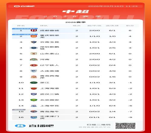 山东泰山刚刚清零,上海申花仍旧是负6分,北京国安和上海海港仍旧是负2分,浙江俱乐部也是负1分,这些球队和成都蓉城的积分差距还是比较大的,但联赛毕竟刚刚进行了两轮,争冠大势还需继续观察。