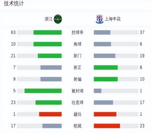 这场比赛,上海申花从场面到结果,都无法让人满意。赛后数据显示,上海申花面对浙江队,竟然全面处于劣势,控球率只有37%,角球比浙江队少4个,射门次数、传球成功率以及任意球次数,都不如浙江队。从数据统计看,上海申花最终能1:1战平浙江,不仅不应该感到遗憾,还应该感到庆幸。